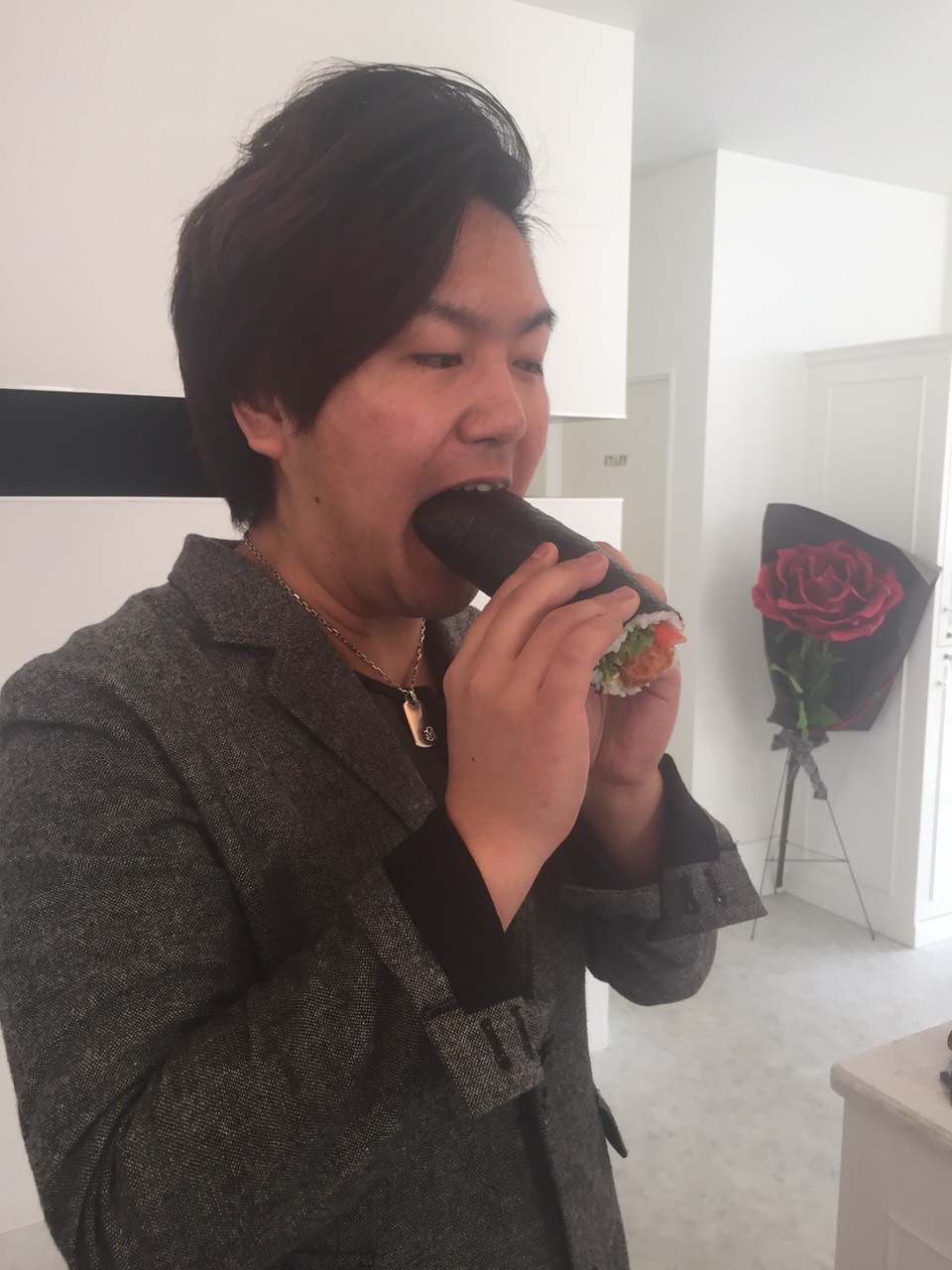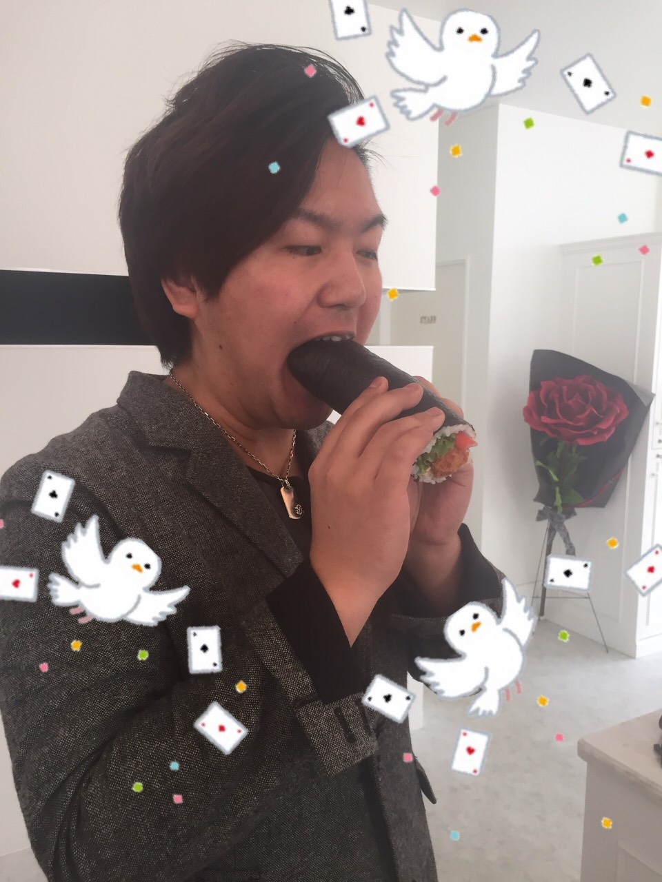 口から恵方巻きを出している手品師に見えませんか??