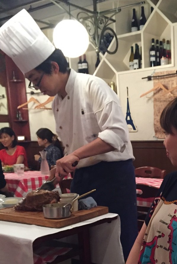 シェフが肉に夢中になりすぎてメガネが“ごはんですよ”の“のり平”みたいになっていくことだ