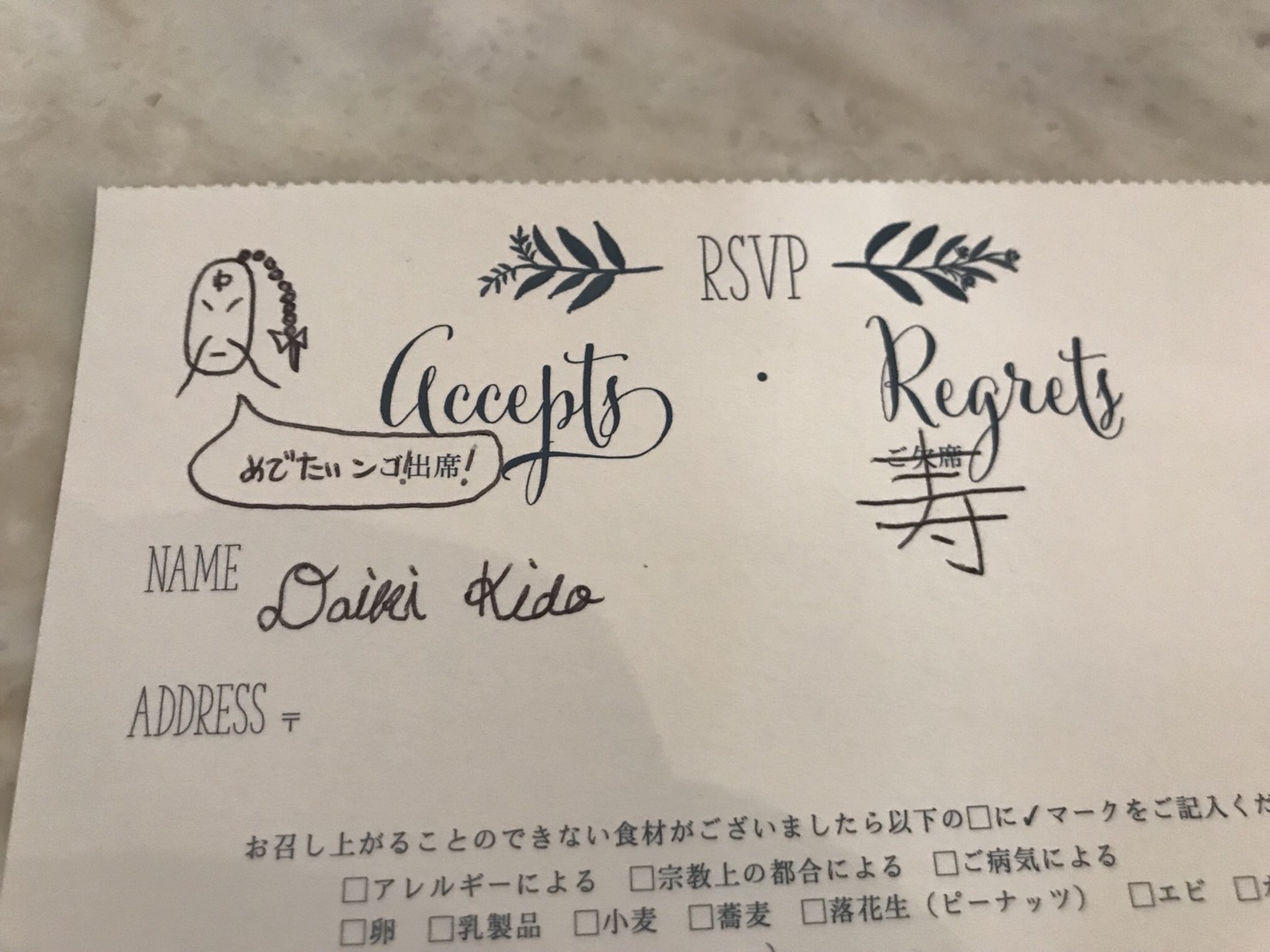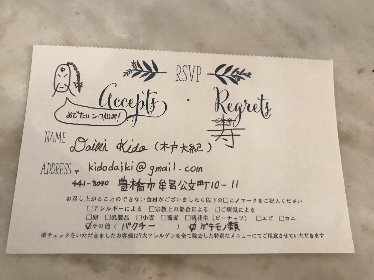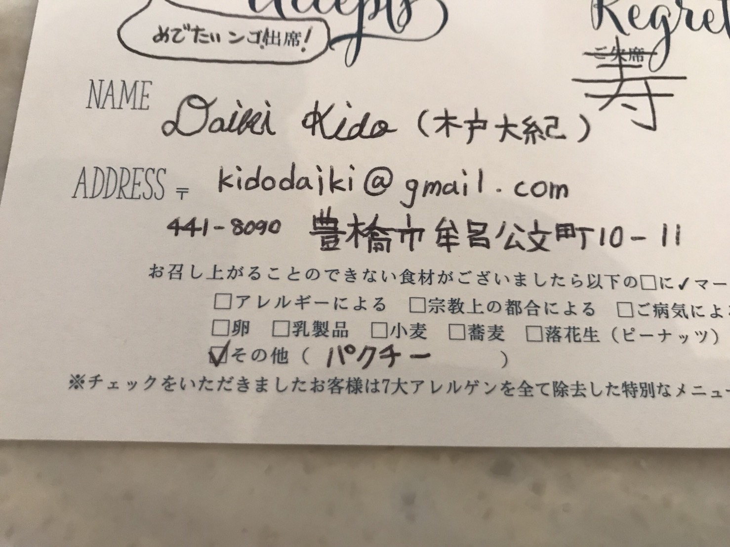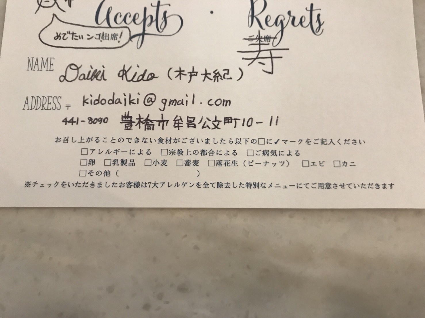 これで返信のハガキは完成である
