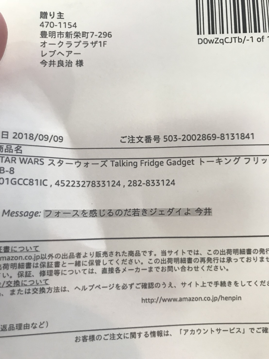 たぶん配達員さんも何となく何系のものが入っているか想像がついたと思う