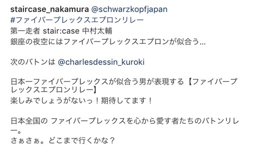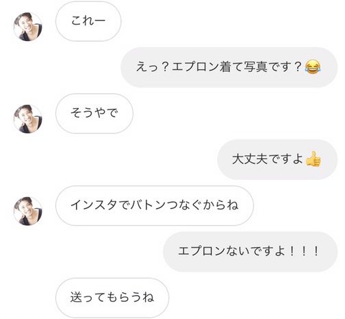 この方からエプロンを着た画像をインスタにアップさせてバトンを回していくらしい