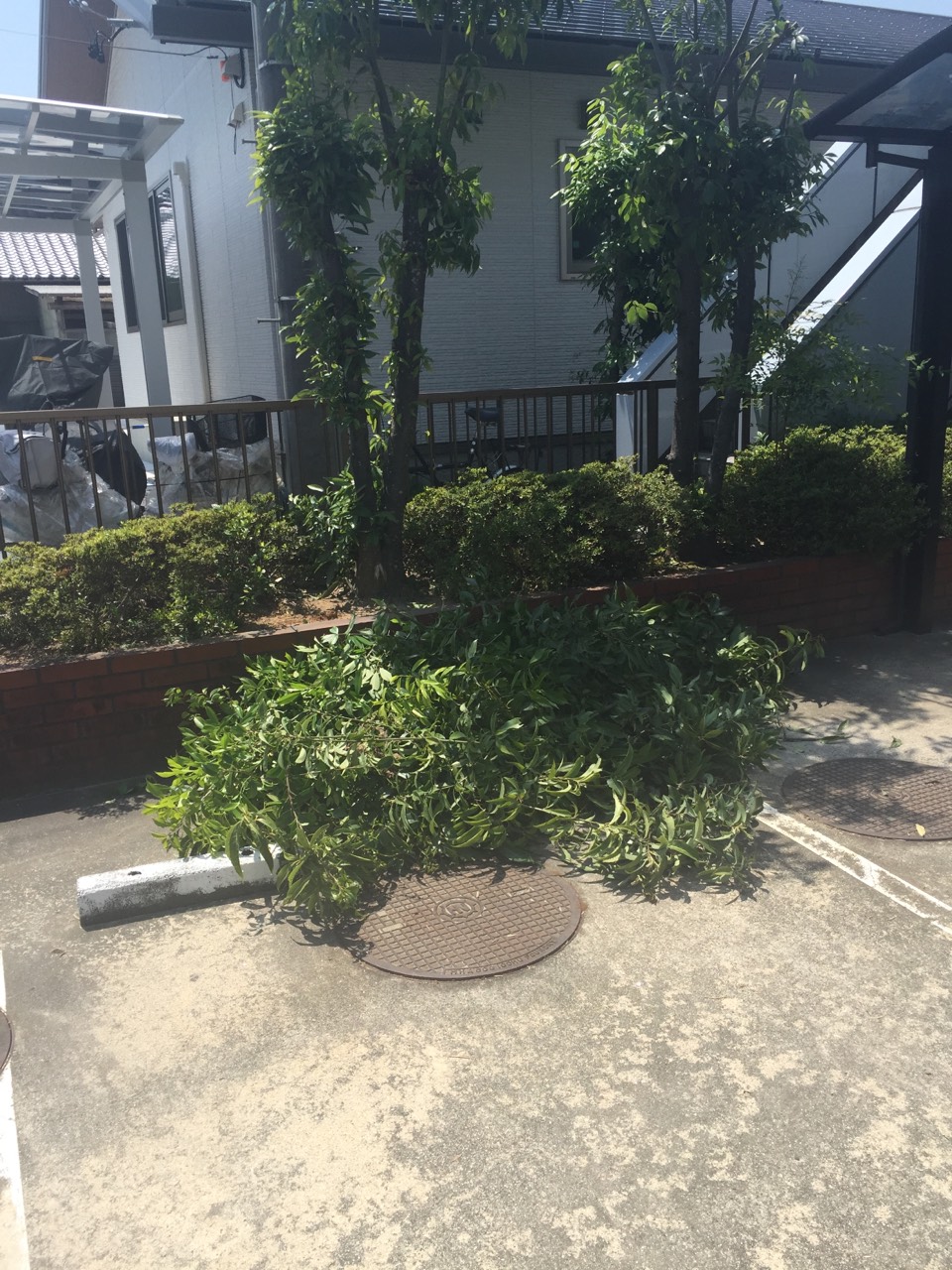 お店によると大家さんが駐車場の手入れをしていた